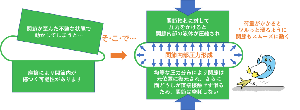 関節は関節包と呼ばれる袋でつつまれるある意味密閉空間であり、内部に圧力を形成することができます。この関節の間には関節液という液体で満たされ、圧力流体を形成します。
