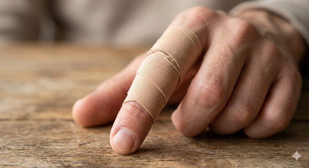 痛みを楽にする「正しいテーピング」のコツ 関節を安静に保つにはテーピングが有効です。コツは、血行を妨げないよう「キツく巻かない」こと。指用の12mm幅程度の伸縮テープを使い、らせん状に巻くのが基本です。第一関節が曲がると痛い場合は、指の腹側に一本縦にテープを貼ってから軽くらせんで固定すると、動きを適度に制限できます。最近では、水仕事ができる透明シールやシリコンサポーターも活用されています。